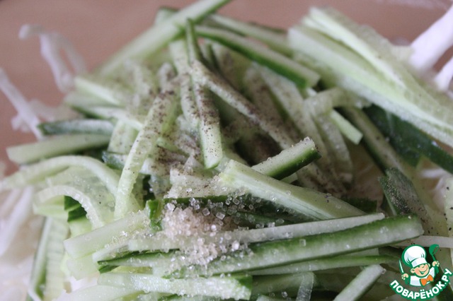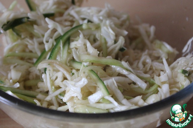 Капусту нашинковать мелко. Огурец нарезать соломкой. Соединить лук, огурец и капусту