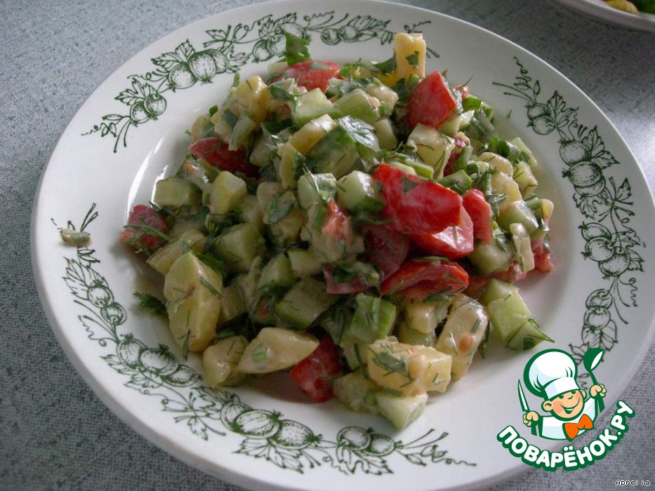 P.S. Салат этот лучше делать до умывания, чтобы за время этой процедуры он мог настояться: помидор и огурцы дадут сок, которым пропитается картофель.