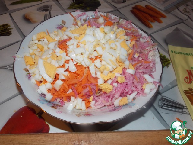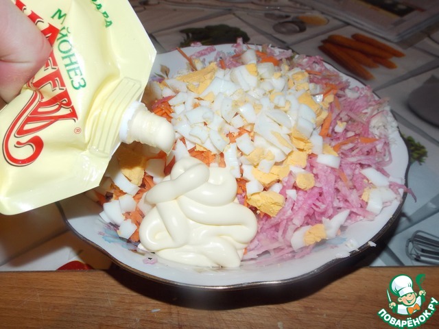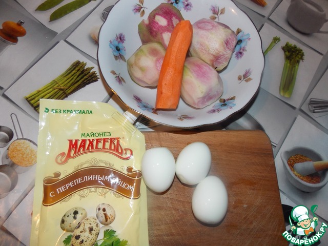 Ингредиенты на салат из дайкона...3 яйца,1 морковка,500 гр дайкона, майонез 2 ст. ложки. У меня дайкон был розовый ( в этом году уродился только розовый), в магазинах продают обычно белый и он не круглый как у меня а длинный и большой...