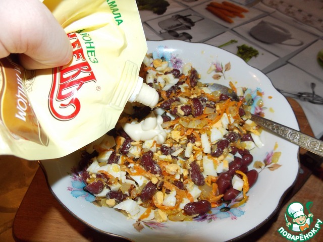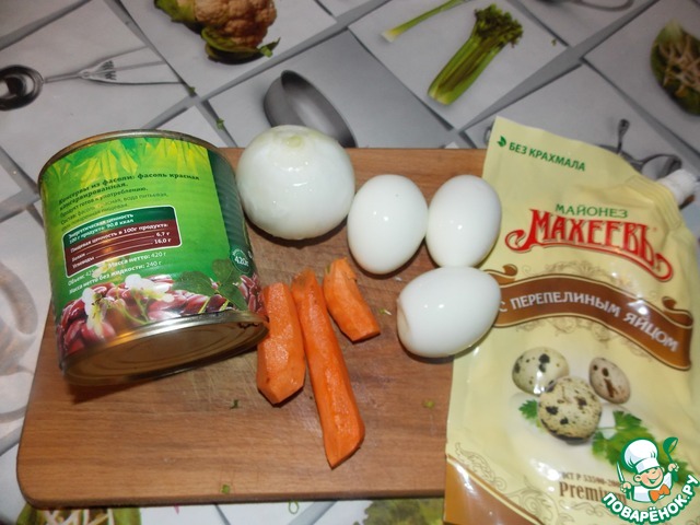 Ингредиенты для салата из фасоли... Для него нам понадобится 1 банка консервированной фасоли в собственном соку,3 яйца,1 луковица,1 морковка ( у меня было 3 мелких, но их можно считать как за 1 среднею морковку) и майонез.