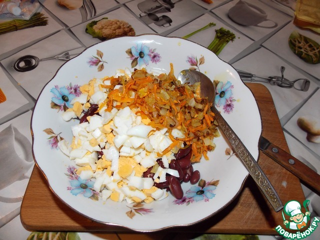 Пока жарится лук и морковка.. Сливаем с фасоли сок и высыпаем фалось в удобную миску.