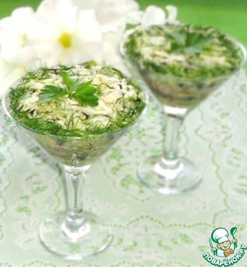 Сверху посыпать салат зеленью укропа и украсить петрушкой.