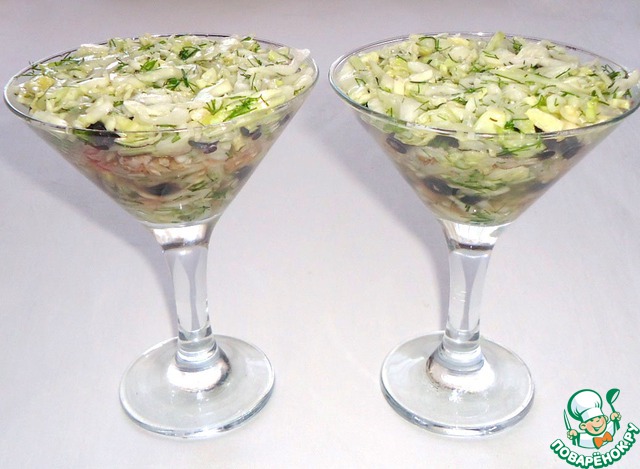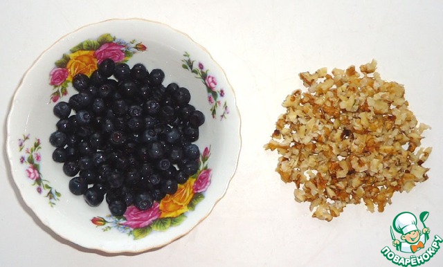 Салат я подавала в бокалах. Салат выложить слоями в такой последовательности: капуста, черника, капуста, грецкие орехи, капуста, черника и т. д., пока не заполнятся бокалы.