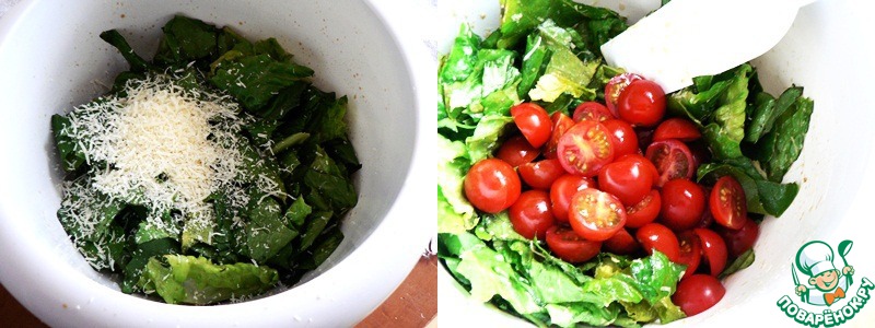 Пармезан натереть на мелкую тёрку, часть сыра добавить к листьям салата, снова перемешать. Томаты разрезать на две часть, добавить к салатным листьям.