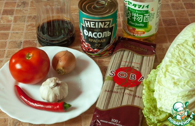 Для нашего салата понадобятся: гречневая лапша соба, банка красной фасоли, пекинская капуста, помидор, лук, 1 небольшой перчик чили. Заправка простая: оливковое масло (забыла на фото), соевый соус, рисовый уксус (он более мягкий) и чеснок.