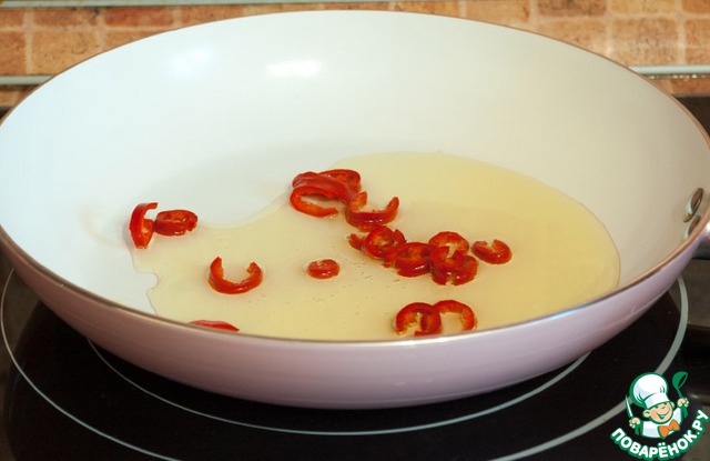 Пока варится лапша, чистим от семечек и нарезаем небольшой чили. Если у вас очень острый, можно ополоснуть нарезанный кипятком.