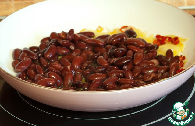 Добавляем фасоль к луку и чили, обжариваем еще минуты 3-4. Затем выкладываем на тарелку, чтобы остыло.