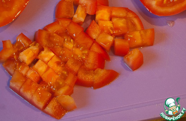 Помидор нарезаем кубиками. А от пекинской капусты отрезаем верх, где листья более мягкие, разрываем листья руками.