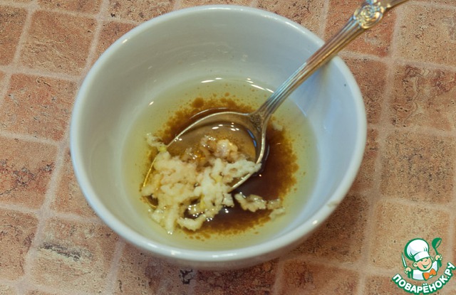 Делаем заправку. В чашке смешать 3 чайных ложки оливкового масла, 1 чайную ложку рисового уксуса, 1 чайную ложку соевого соуса и раздавить через пресс 3 зубчика чеснока. Все перемешать.
