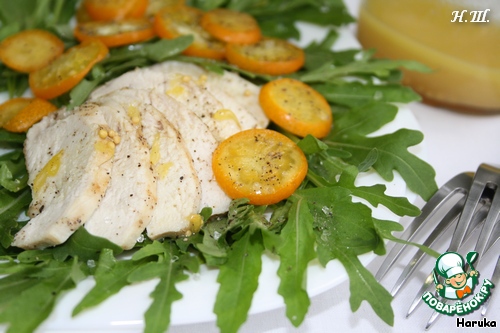 В чашке смешать рукколу, кумкват и кусочки филе, полить соусом, посолить, поперчить.