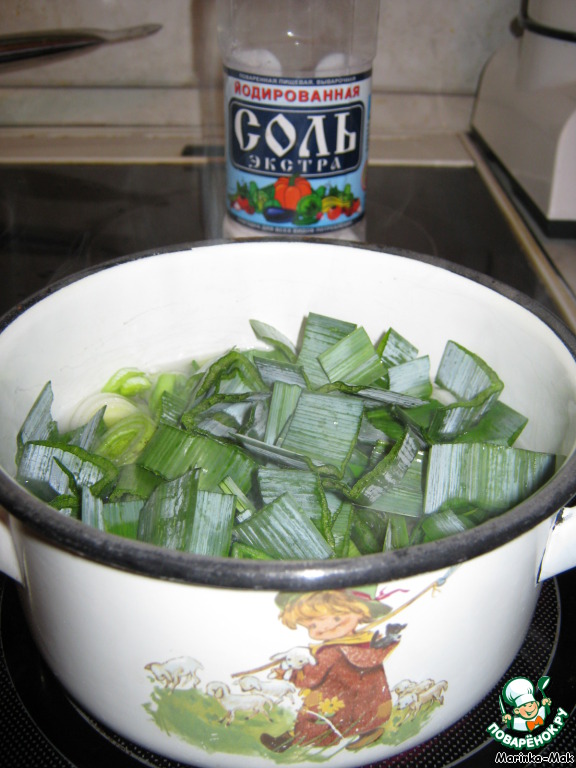 Очистить стебли лука-порея, нарезать кусочками длиной в 3-4 см и отварить в подсоленной воде.