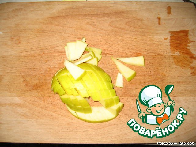 … рубим яблоки вот так, грецкий орех и опять сметана. Чтобы лучше размазать сметану на грецкий орех используйте столовый нож.