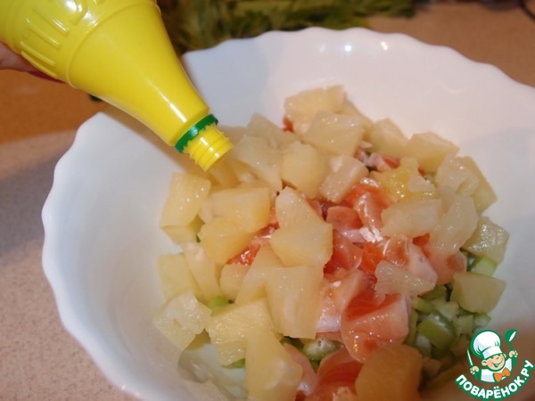 Теперь открываем ананасы и выкладываем их в салатницу. Количество определяем по вкусу. Я добавляю еще 1-2 ч. ложки ананасового сиропчика.