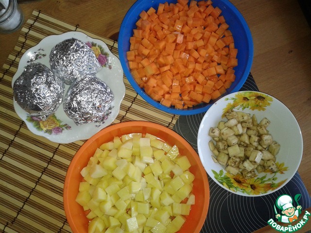 Овощи моем. Свёклу заворачиваем в фольгу. Морковь, картофель, баклажаны чистим, режем кубиком, и натираем растительным маслом и солью, выкладываем в форму для запекания, и отправляем в духовку, разогретую до 180-200 градусов. Время приготовления овощей зависит от возможности Вашей духовки. картофель и морковь запекаются примерно за 20 минут, ну а свёкла около 100-120 минут. Лучше это делать с вечера, и оставить свёклу остывать в духовке.