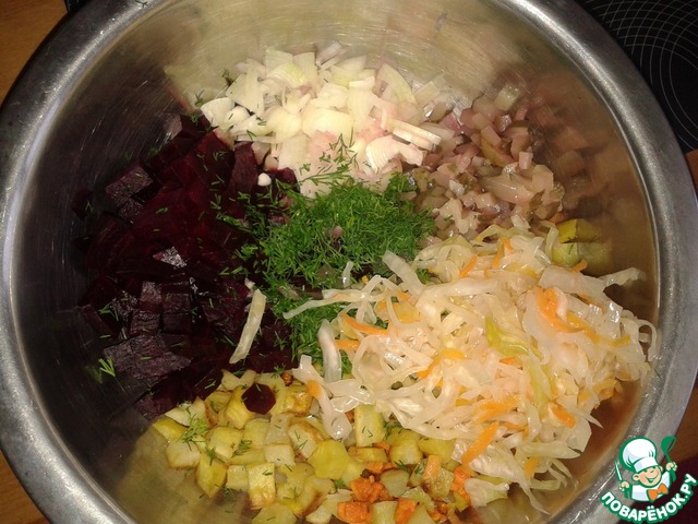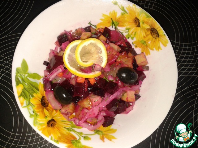| Недавно открыла для себя этот рецепт, и была приятно удивлена пикантным и непривычным вкусом, такого традиционного для русской кухни блюда. Готовился мой винегрет из того, что есть в холодильнике)) Зелёного горошка в этот раз не оказалось)) |