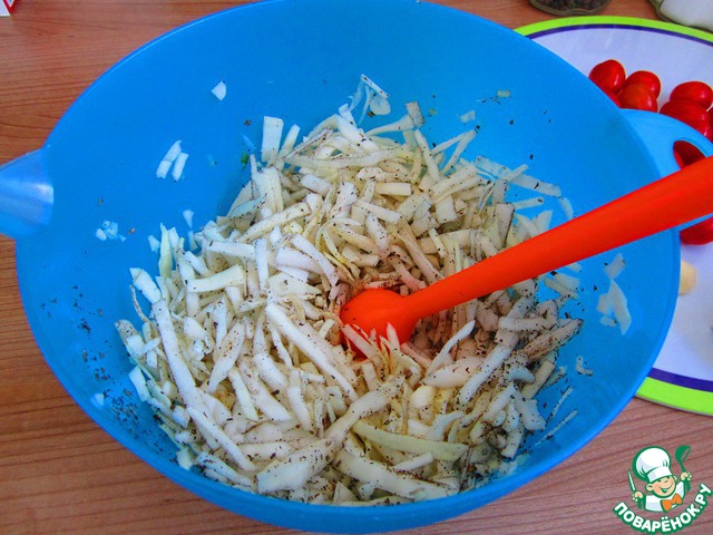 Если капуста жесткая, можно добавить к ней соль, базилик, черный перец и помять, чтобы она стала мягче и специи отдали ей свой аромат.