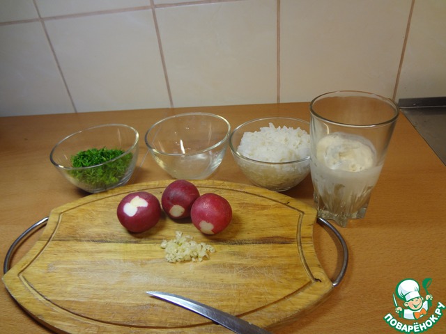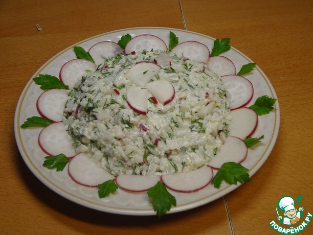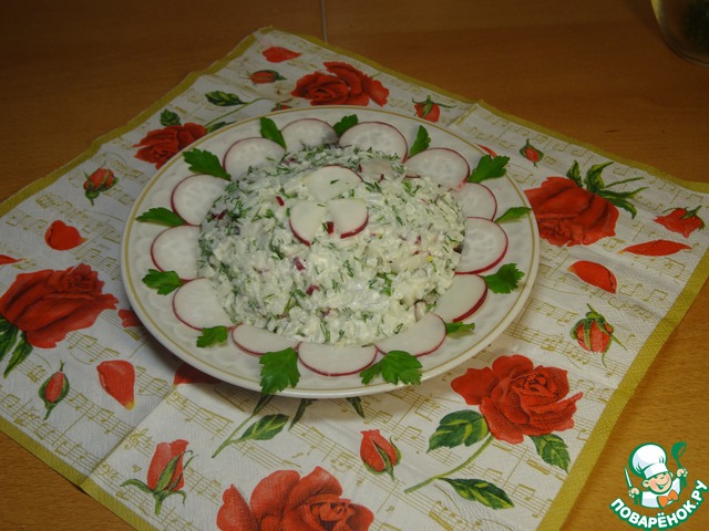 | Очень легкий и вкусный салат из риса, укропа и редиса. |
