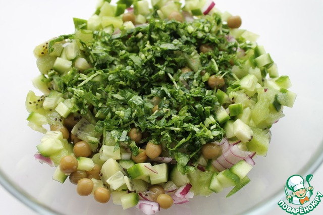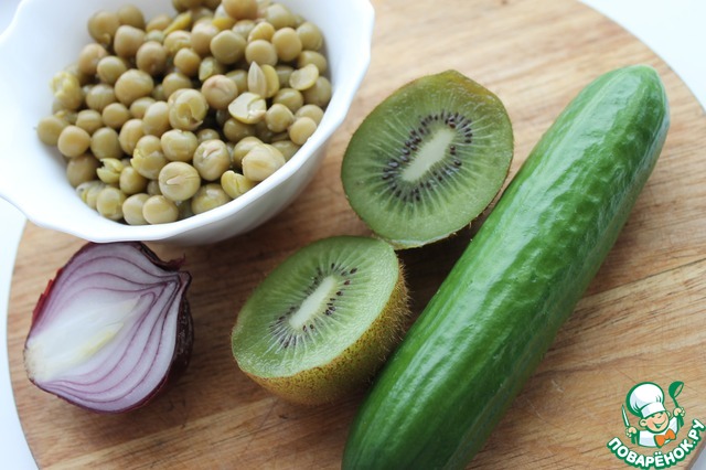 Огурец, лук и очищенное киви режем мелким кубиком. Добавляем горошек и зелень мелко - нарезанную.