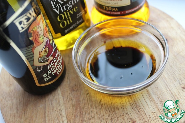 Для заправки смешиваем 2 вида масла ( это на ваш вкус ), добавляем ложку бальзамико, соль, перец и хорошо перемешиваем вилкой.