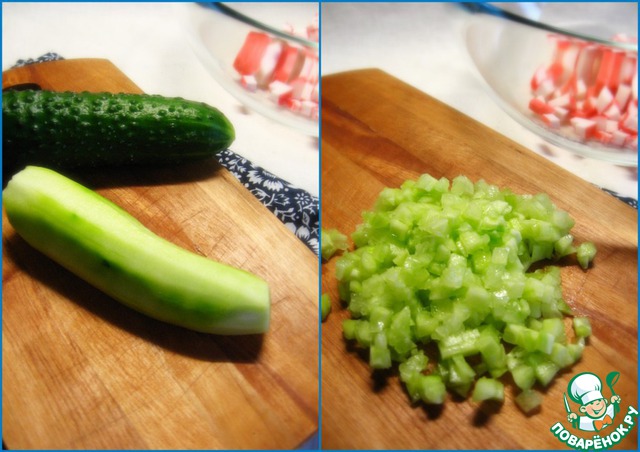 Огурец почистить и нарезать маленькими кубиками.
