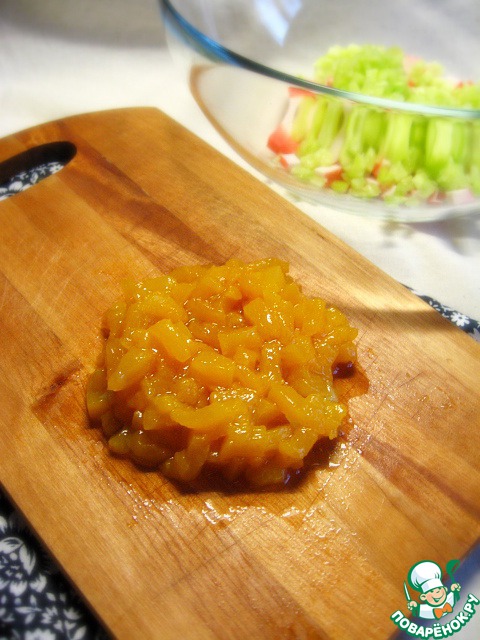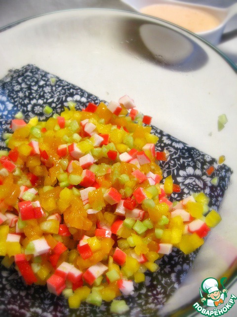 Нарезать кубиками размороженные крабовые палочки.