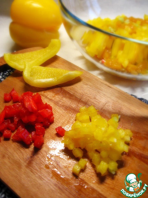 У перца удалить семена. Нарезать его мелкими кубиками. Большую часть перца красного цвета положить в блендер.