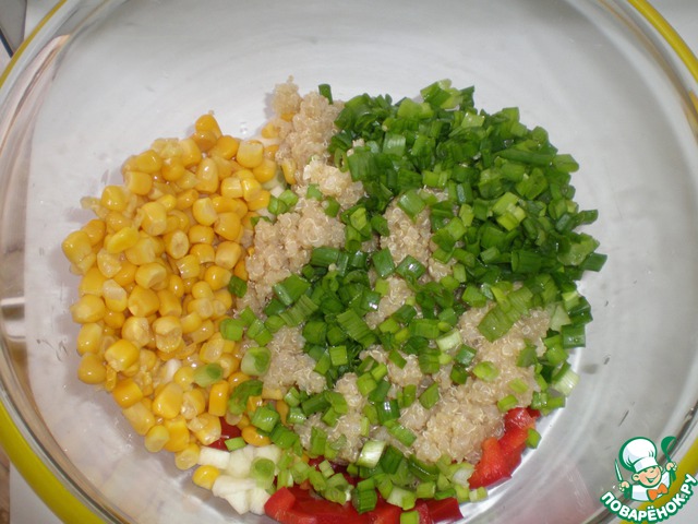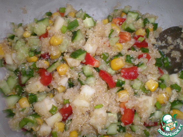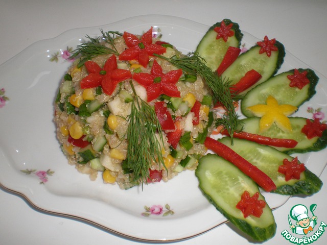 | Предлагаю вам аппетитный и очень вкусный салат. Он вам обязательно понравится. В нем очень удачно сочетается кукуруза и киноа, а свежие овощи делают его легким. Попробуйте приготовить и за несколько минут, у вас будет замечательное блюдо для постного меню. |