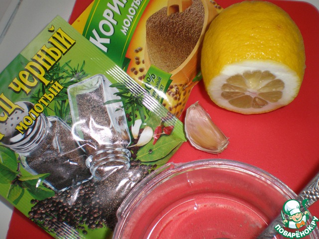 Для заправки смешиваем оливковое масло, сок лимона, измельченный чеснок, соль, перец, Я добавляю еще щепотку кориандра.