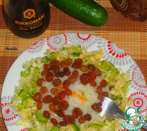 Вокруг рисовой горки раскладываем капусту с огурцами. С изюма слить воду. Рис посыпаем изюмом. Соединяем растительное масло с соевым соусом Kikkoman и поливаем сверху салат. Подаем салат к столу.