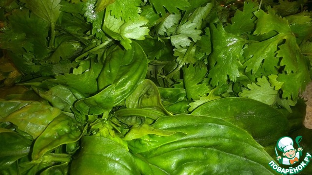 Зелень, мой любимый базилик и кинза, моем и тоже режем мелко.