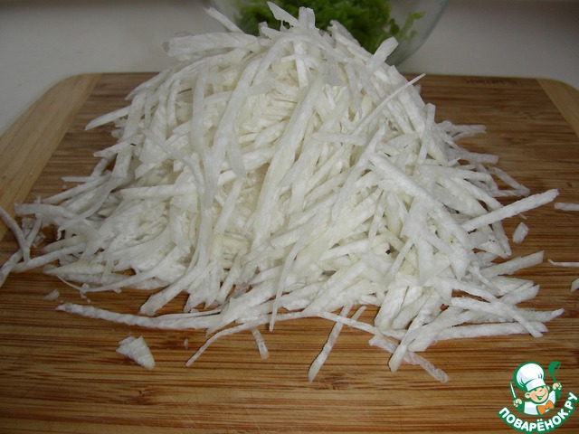 Режем редьку тонкими полосками. Я делаю всё вручную, т. к. на тёрке получаются некрасивые ломтики и вытекает сок.