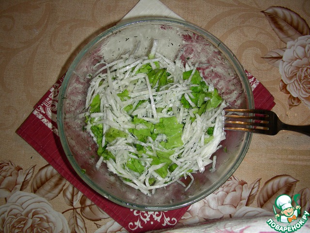 Перемешиваем редьку, зелёный салат, добавляем укроп, масло растительное, соль, сахар по вкусу. Даём немного настояться.