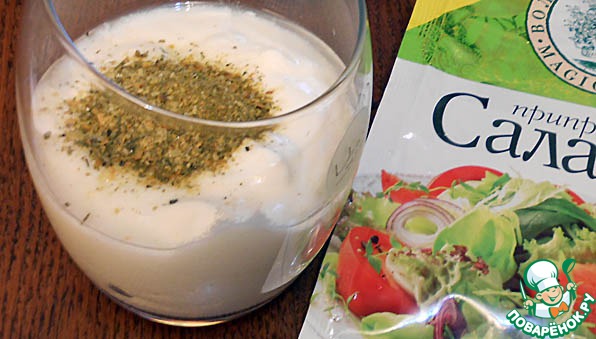 Йогурт (у меня был домашний, приготовленный из 6%-го молока и 1% закваски) смешать с приправой. Вы можете использовать приправу по вкусу. Главное, чтобы соус получился достаточно соленым, слегка острым и пикантным.
