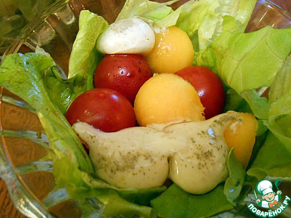 На листья уложить по 2-3 шарика тыквы и помидорок-черри. Их также сбрызнуть бальзамическим уксусом.