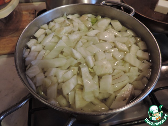 Отварить в подсоленой кипящей воде 5 мин. Больше не надо, иначе при тушении в смеси масел разварится окончательно, нам это не нужно