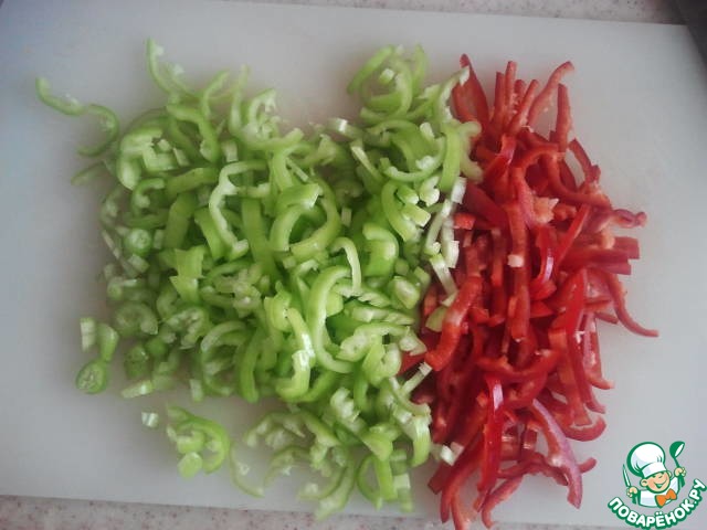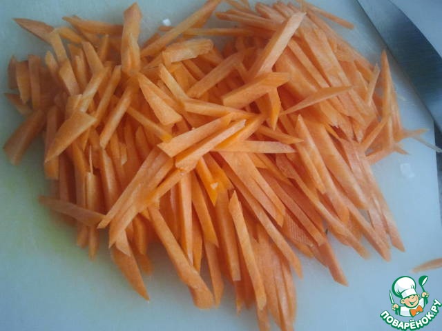 Огурцы мы отчищаем от шкурки и режим красивой соломкой.