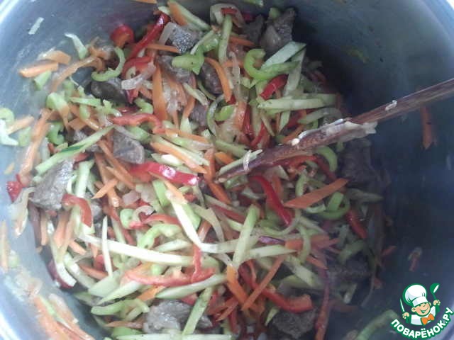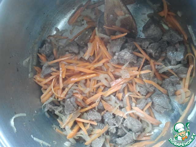Мясо режим на небольшие квадратики, обживаем на масле.