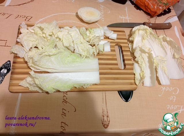 Нарезаем пекинскую капусту, если листы небольшие, то можно разрезать вдоль и поперек)