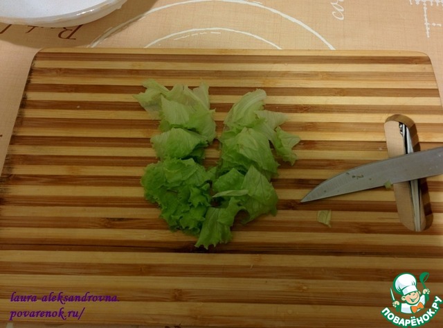 Листья салата, как и пекинскую капусту, разрезаем вдоль и поперек ;)