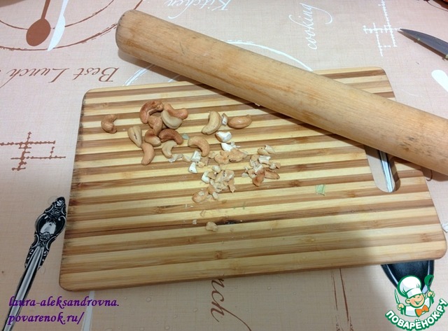 Скалкой "ломаем" кешью, можно и руками, они не такие уж и твердые, но это будет дольше) Добавлять по вкусу.