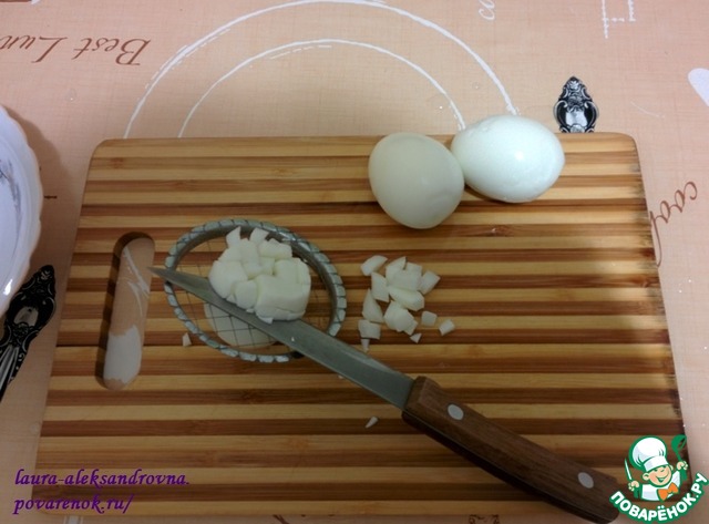 Режем яйца кубиками. Я это делаю при помощи "помощника", но можно и вручную)
