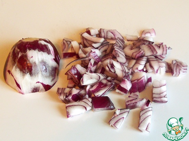 Для этого салата лук нужно выбрать неострый, причём. чтобы салат смотрелся интереснее, лук лучше взять красный. Режем лук довольно мелко, на "шашечки". Выкладываем в миску и сразу же поливаем уксусом, перемешиваем.