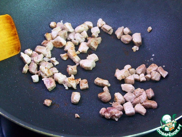 Мясо режем на небольшие кубики, слегка отбиваем, посыпаем молотым чёрным перцем (немного). Вместо мяса можно использовать мясную часть бекона, нежирную ветчину.