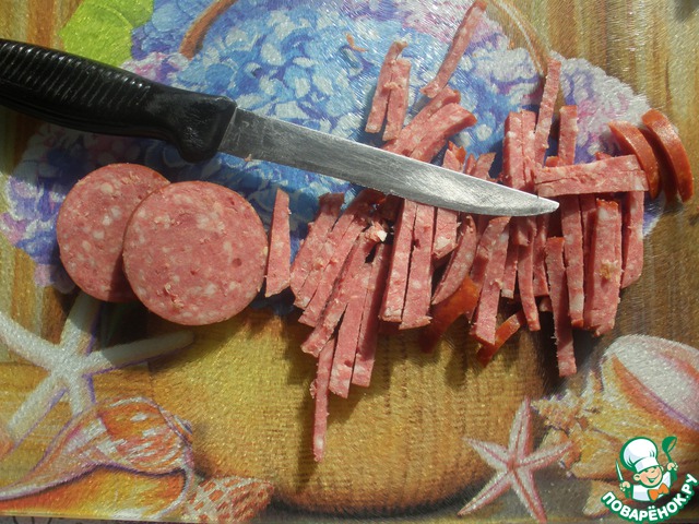 Режем копченую колбасу.