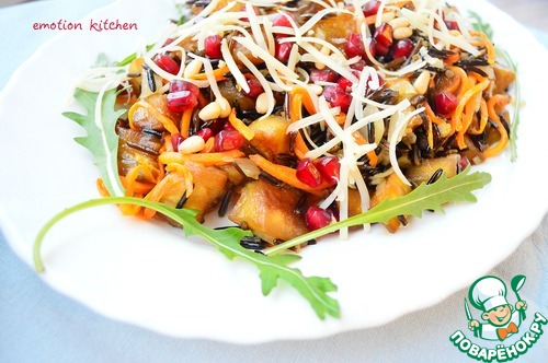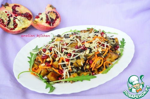 Смешайте ингредиенты и выложите на блюдо. Добавьте зёрна граната, ядра кедрового ореха и тёртый пармезан. Подавайте! Приятного вам аппетита!