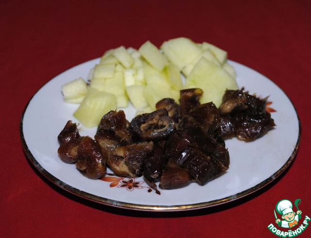 Яблоки очистить от кожуры. Далее нарезаем яблоки и финики на небольшие брусочки.