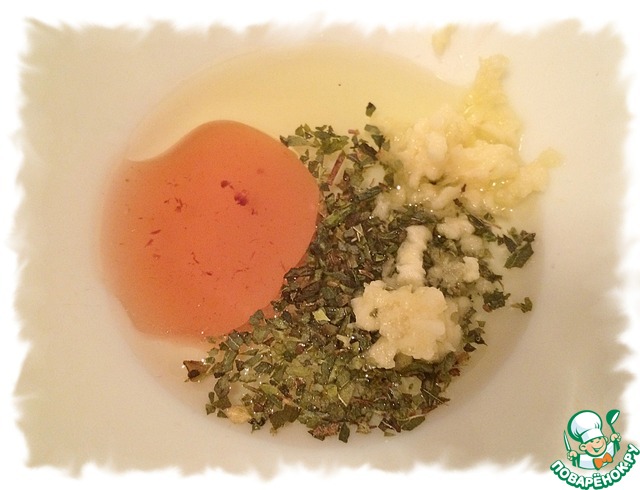 Приготовить заправку. Смешать масло, сок от оливок, орегано и выдавить туда же чеснок.