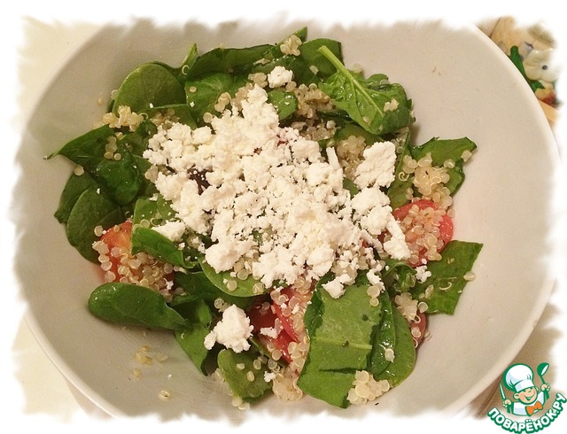 Киноа, шпинат, помидоры и оливки смешать и полить заправкой.
