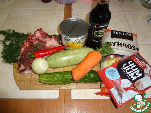 Итак подготовим ингредиенты: почистим лук и морковь, вымоем мясо, кабачок, укроп и огурчик, откроем и сольем кукурузу.
