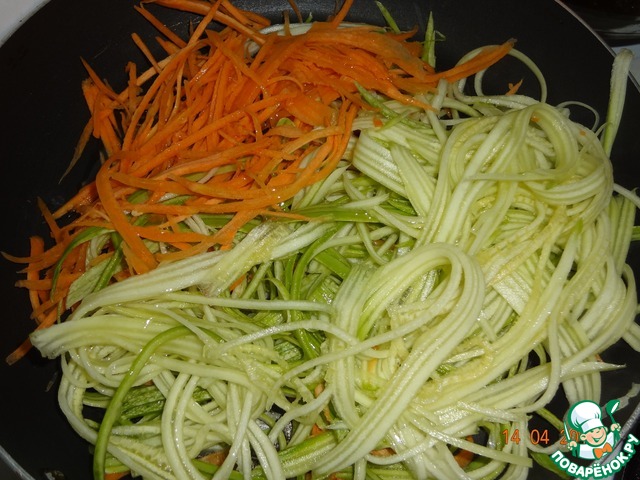 Первым делом займемся овощами. Морковь и кабачок потрем на терке, чтобы получились красивые длинные полосочки. Отправляем овощи на сковородку, и добавляем небольшое количество растительного масла ( можно оливковое - у меня закончилось поэтому обходилась тем что было) Долго не держите, каша нам не нужна - примерно 2 минуты